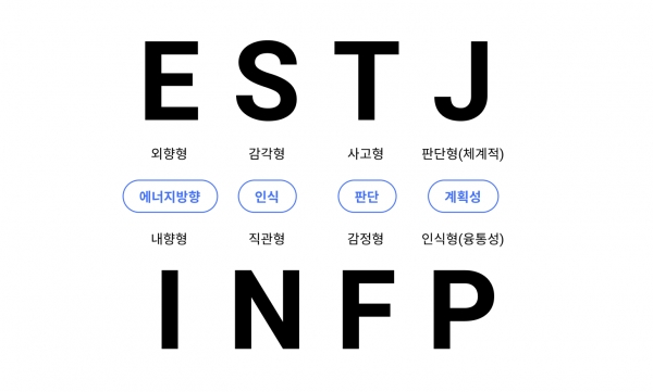 MBTI는 다음 네 가지 요소를 기반으로 성격 유형을 분류합니다.